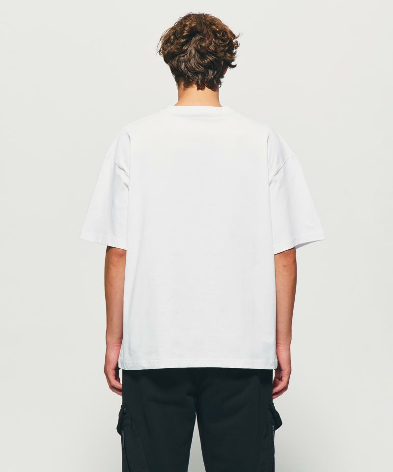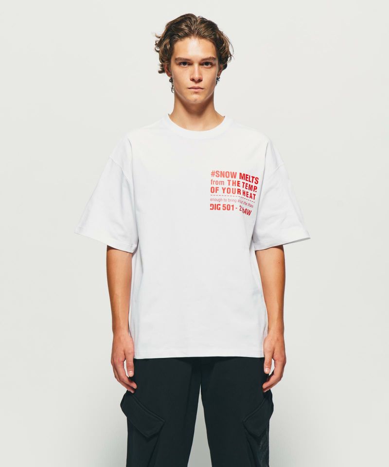 モノトーンの潔さとスローガンプリントを融合させた「THERMAL BORDER PRINTED T-SHIRT」。シンプルながらもフロントにあしらわれたレッドのテキストがアクセントとなり、コーディネートに存在感をプラスします。