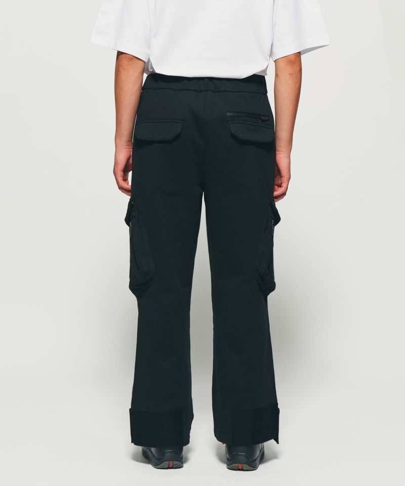 機能性とデザイン性を両立させた「THERMAL BORDER PRINTED SWEAT CARGO PANTS」。ゆったりとしたシルエットに大きめのポケットを配し、実用性とストリート感を兼ね備えた一本です。