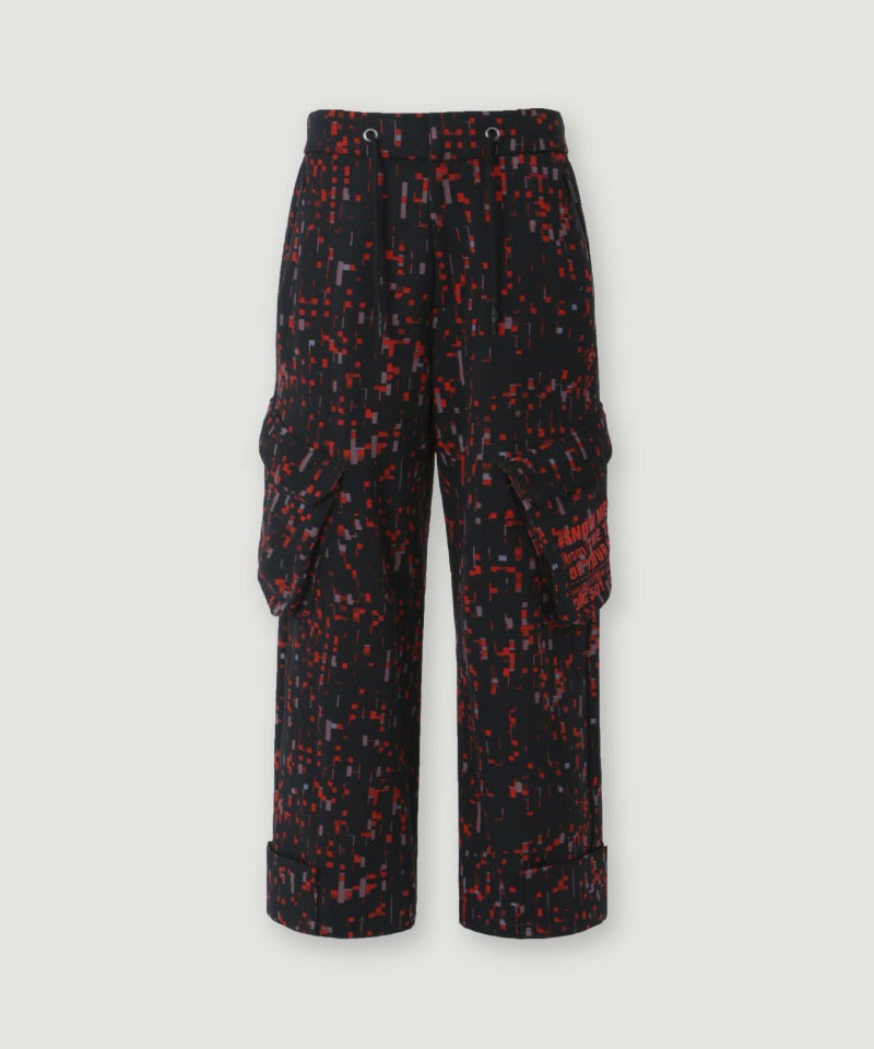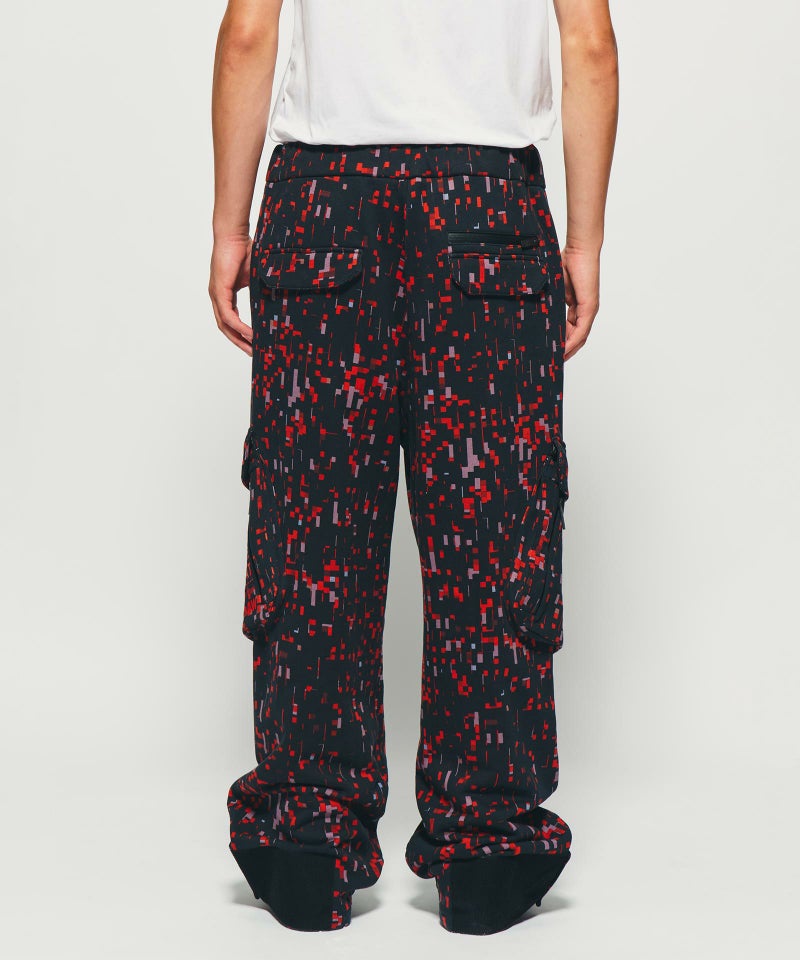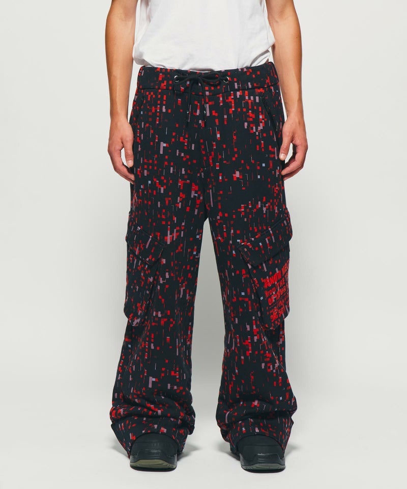 機能性とデザイン性を両立させた「THERMAL BORDER PRINTED SWEAT CARGO PANTS」。ゆったりとしたシルエットに大きめのポケットを配し、実用性とストリート感を兼ね備えた一本です。