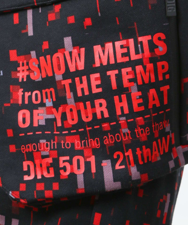 アクセントとなるレッドのプリントがモノトーンスタイルに高揚感を与え、シンプルながらも存在感を放ちます。ブラック、ホワイト、NOISE_REDの3色展開で、スタイリングや気分に合わせた選択が可能。
