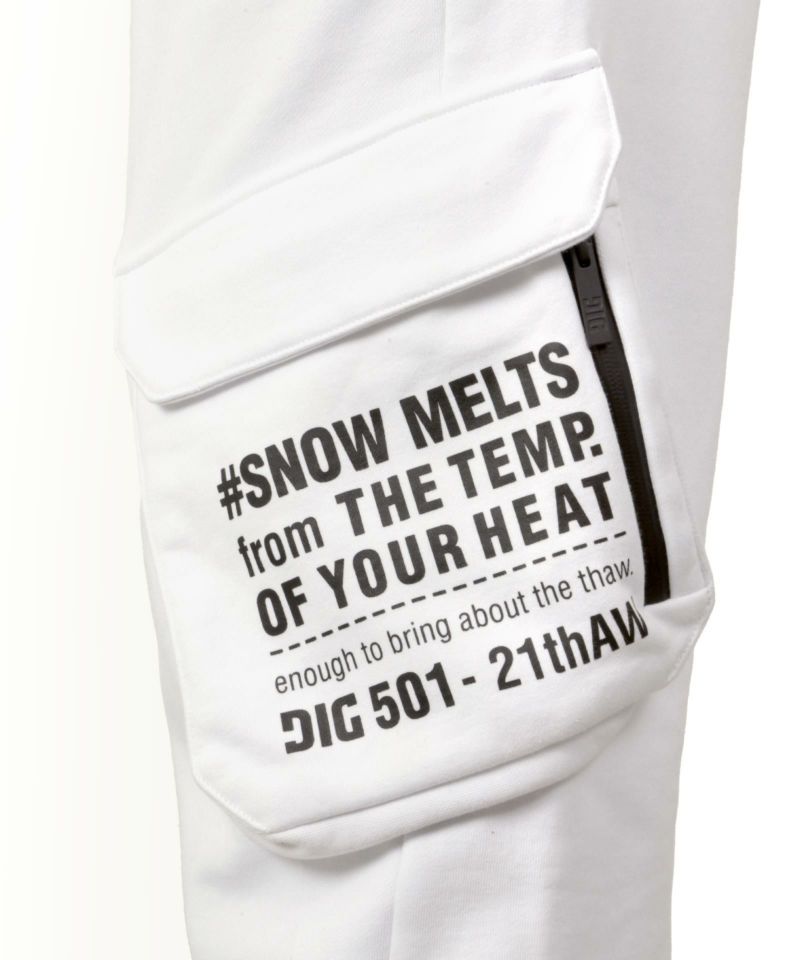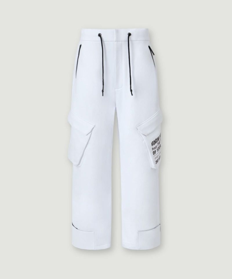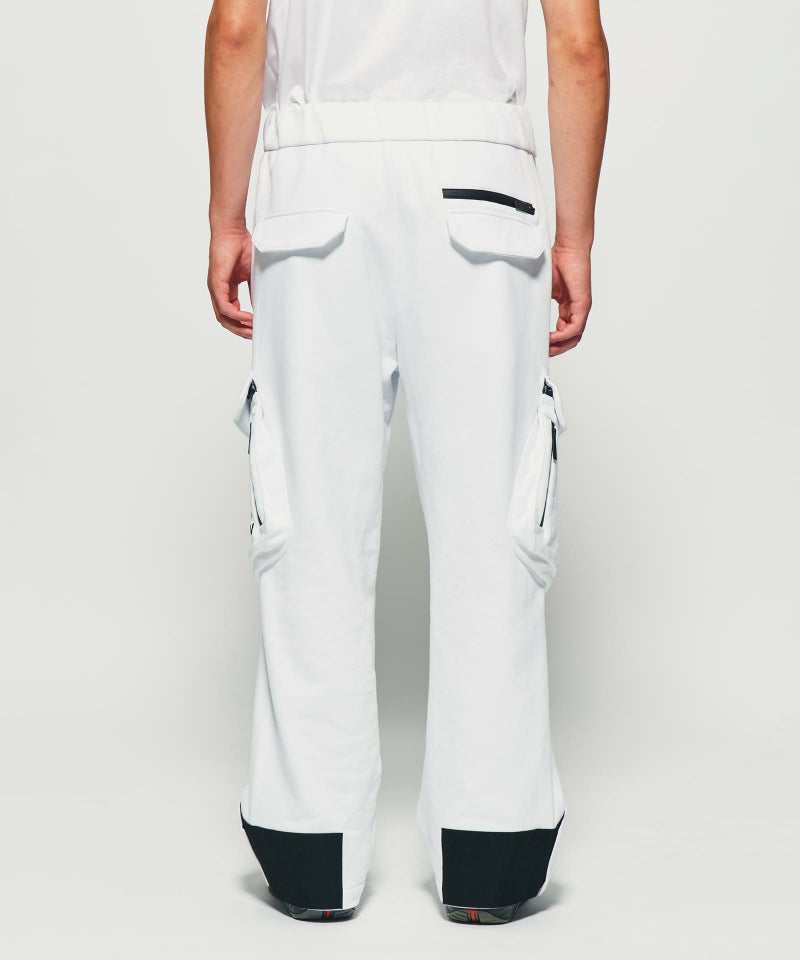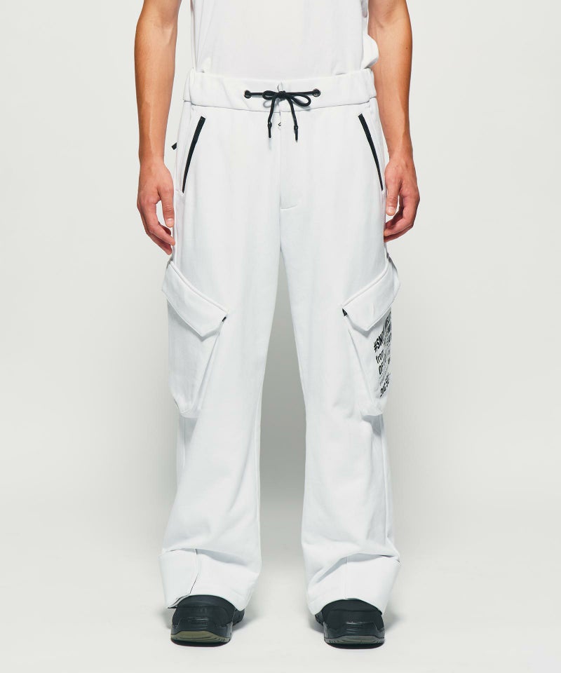 機能性とデザイン性を両立させた「THERMAL BORDER PRINTED SWEAT CARGO PANTS」。ゆったりとしたシルエットに大きめのポケットを配し、実用性とストリート感を兼ね備えた一本です。