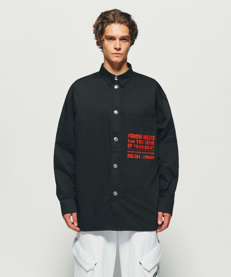 存在感のあるプリントを落とし込んだ「THERMAL BORDER PRINTED OVERSIZED DENIM SHIRT」。胸元に配されたレッドのメッセージがアクセントとなり、シンプルな中にも力強い個性を表現します。