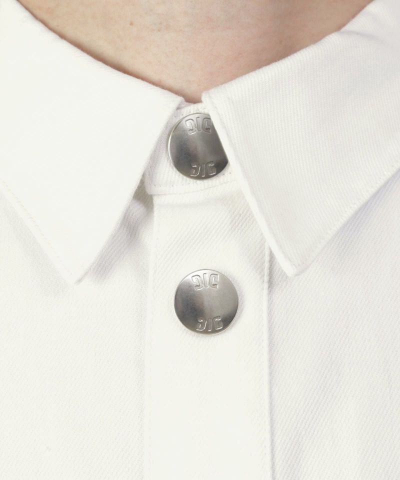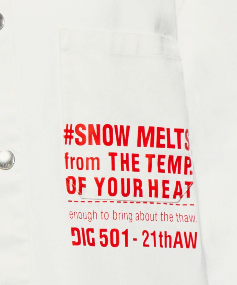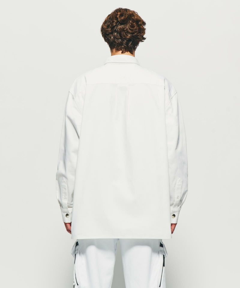存在感のあるプリントを落とし込んだ「THERMAL BORDER PRINTED OVERSIZED DENIM SHIRT」。胸元に配されたレッドのメッセージがアクセントとなり、シンプルな中にも力強い個性を表現します。