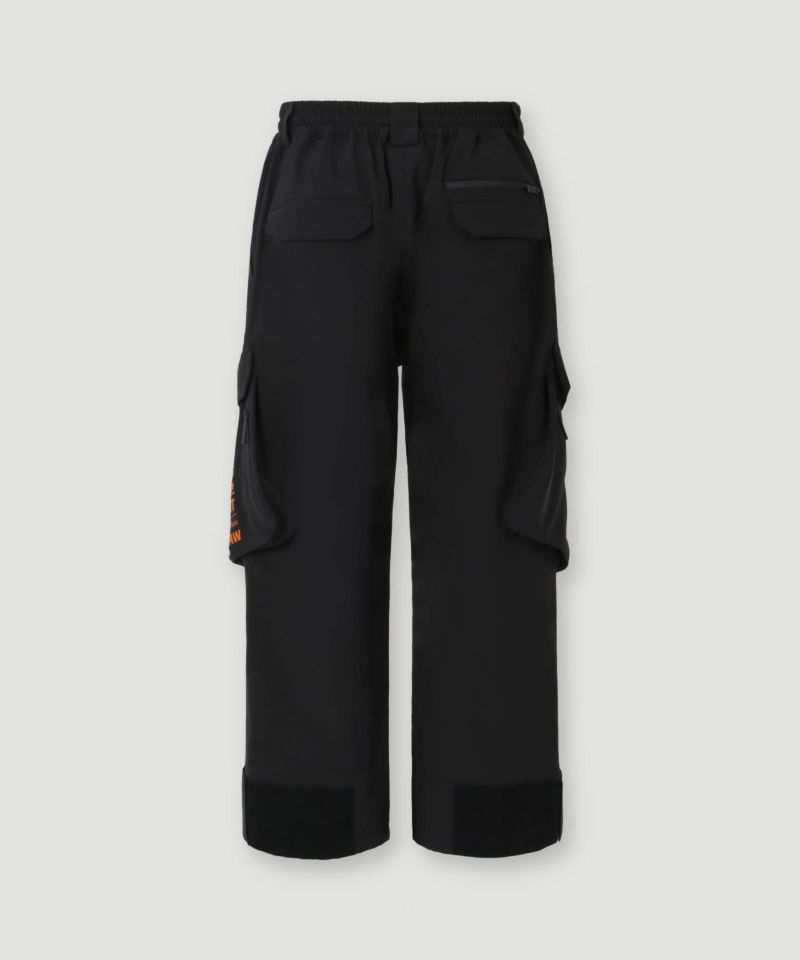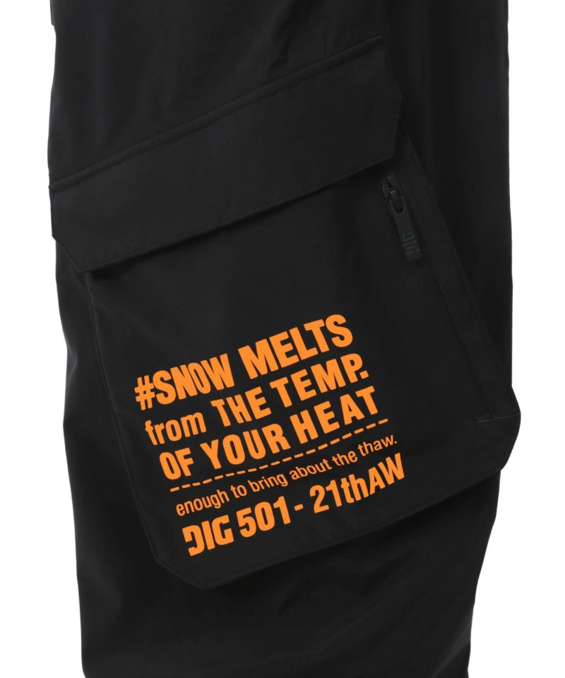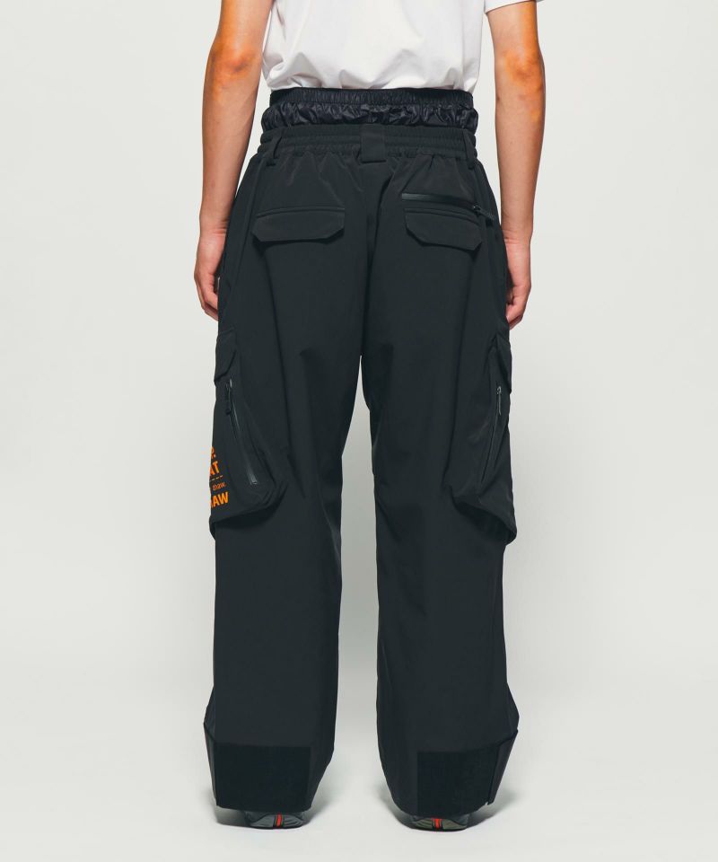「THERMAL BORDER OVERSIZED CARGO PANTS」は、雪原に広がる境界線のような静と動のコントラストを表現したスノーウェアパンツです。左のカーゴポケットにあしらわれたメッセージプリントが、自然との関わりや未来への意識を象徴しています。