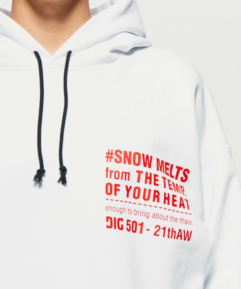 大胆なプリントが魅力の「THERMAL BORDER PRINTED HOODIE」。胸元に施されたレッドのテキストがデザインのアクセントとなり、シンプルながらも存在感のある仕上がりに。
