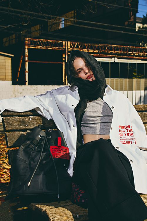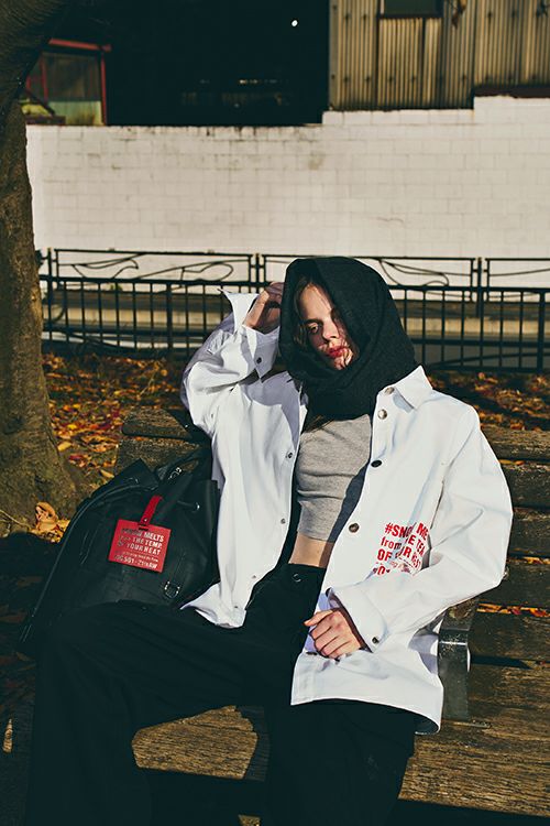 存在感のあるプリントを落とし込んだ「THERMAL BORDER PRINTED OVERSIZED DENIM SHIRT」。胸元に配されたレッドのメッセージがアクセントとなり、シンプルな中にも力強い個性を表現します。