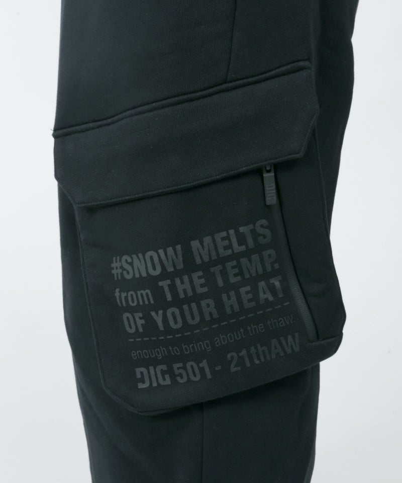 機能性とデザイン性を両立させた「THERMAL BORDER PRINTED SWEAT CARGO PANTS」。ゆったりとしたシルエットに大きめのポケットを配し、実用性とストリート感を兼ね備えた一本です。