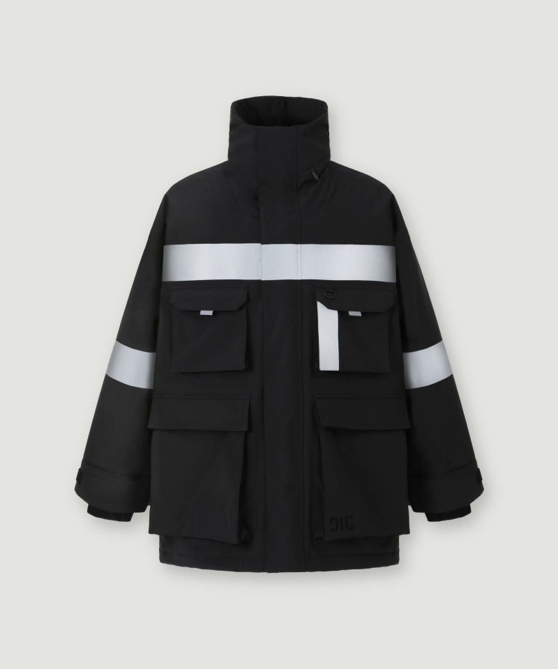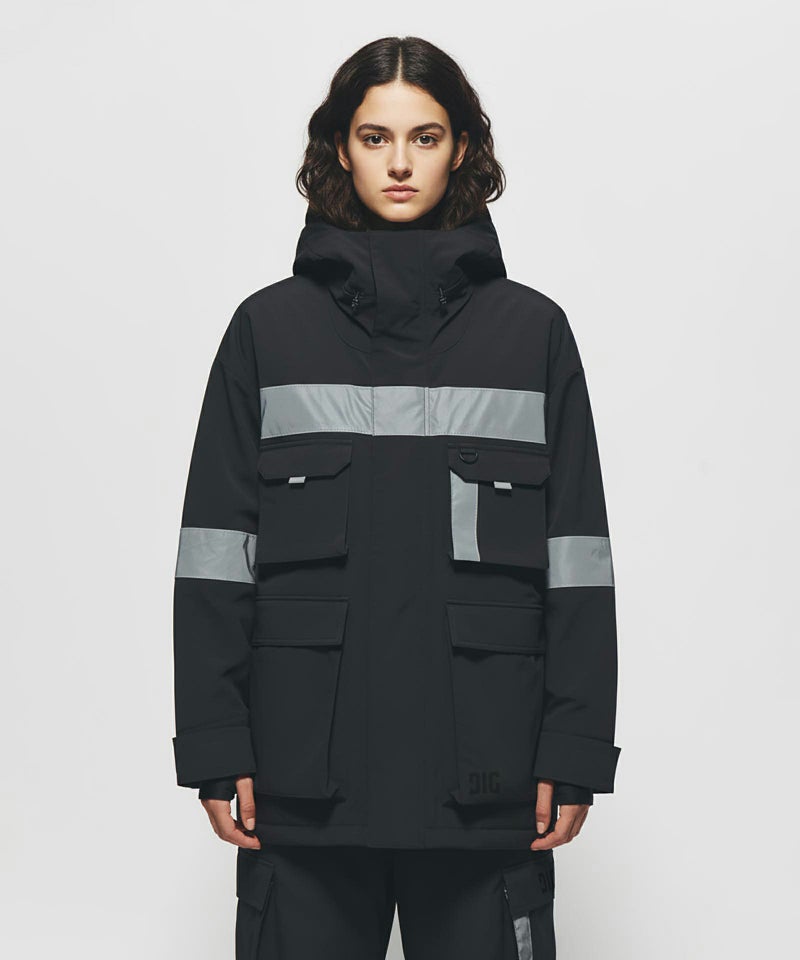 消防士のユニフォームを着想源にした力強いシルエットとリフレクティブなラインは、厳しい環境に挑む人々の姿を映し出し、着る人に頼もしさと高揚感を与えます。黒・赤・青の3色展開はそれぞれ異なる個性を放ち、都市のシーンから雪山まで自在に対応。背面にはメッセージ性のあるプリントを施し、自然と人との関わり、そして未来への視点を投げかけます。