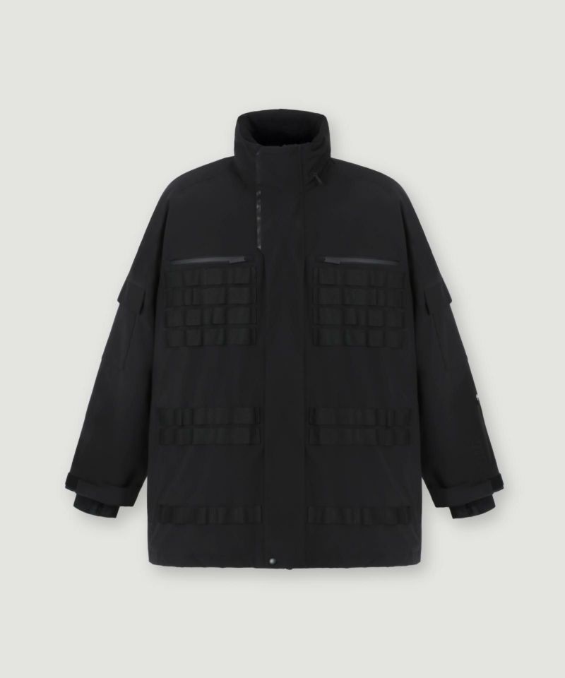 フロントには多様なフックを備え、収納や小物の取り付けが可能な機能性を追求。雪山でのアクティブなシーンはもちろん、シティウェアとしても存在感を放ちます。