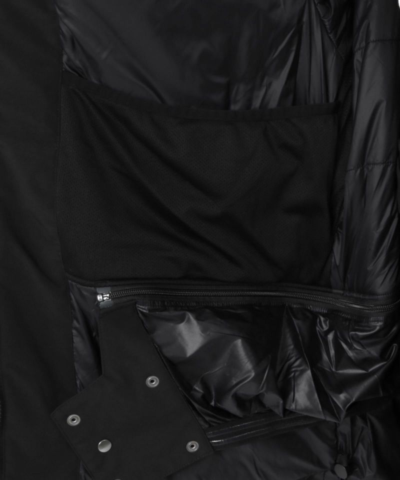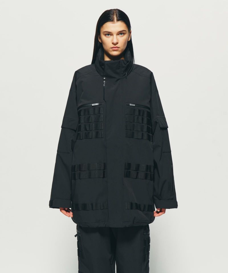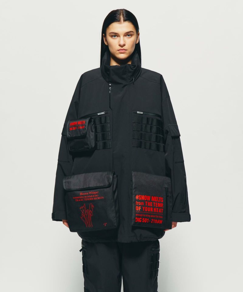フロントには多様なフックを備え、収納や小物の取り付けが可能な機能性を追求。雪山でのアクティブなシーンはもちろん、シティウェアとしても存在感を放ちます。