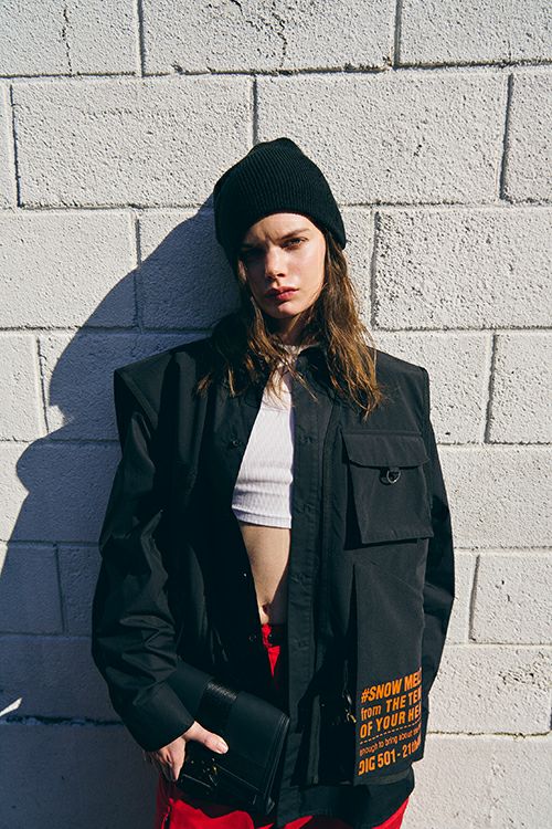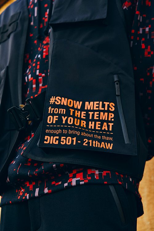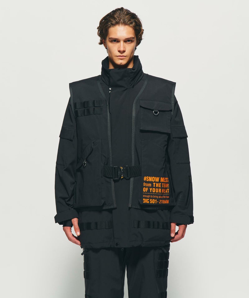 「OVERSIZED COVERED VEST」は、存在感のあるスノーウェアベストです。フロントには特別仕様のバックルを採用し、都会的なアクセントと機能性を両立。